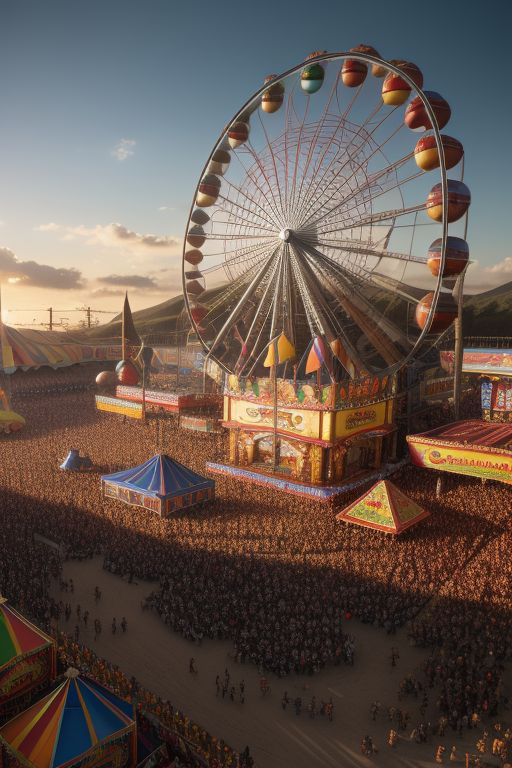 A carnival out in the country with a bunch of fun games. Warm colors and a bunch of differently colored lights